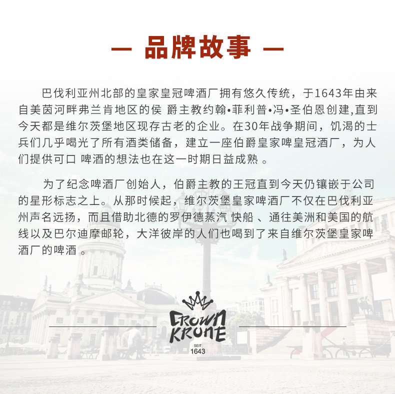 德国皇冠原浆小麦啤酒500ml*24罐 德国皇冠原浆小麦啤酒500ml*24罐 品牌皇冠 原产国德国 净含量500ml 箱规500ml*24罐 配料水、小麦麦芽、大麦麦芽、啤酒花 酒精度5.2%vol 原麦汁浓度5.2%vol 保质期见罐底(年月日) 贮藏方式阴凉干燥处存放 详细信息 上一条德国皇冠之星小麦啤酒500ml*18罐 下一条皇冠精酿岩石啤酒500ml*24罐 您可能喜欢 六只天鹅原浆精酿啤酒10L*1桶 六只天鹅精酿拉格啤酒10L*1桶(绿) 六只天鹅原浆精酿啤酒5L*1桶 六只天鹅精酿拉格啤酒5L*1瓶(绿) 六只天鹅原浆精酿啤酒2L*6桶 六只天鹅原浆精酿啤酒2L*6桶(三八口) 六只天鹅精酿拉格啤酒2L*6桶(三八口) 六只天鹅原浆精酿啤酒1L*6桶 六只天鹅精酿拉格啤酒1L*6桶 六只天鹅原浆精酿啤酒500ML*24罐